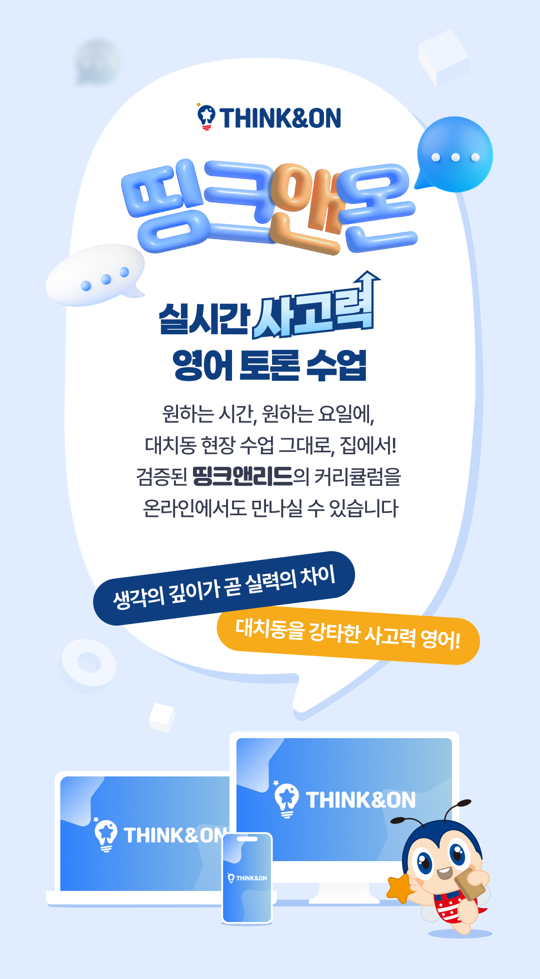원하는 요일, 원하는 시간에 수업을 띵크앤리드 사고력 영어 커리큘럼 그대로 구성된 띵크앤온을 추천드려요!